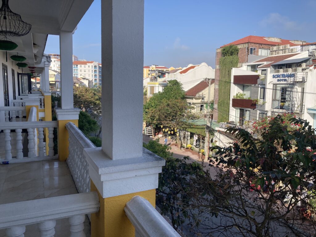 すがすがしい朝、バルコニーから通りを眺める。