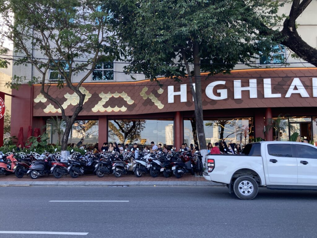 ハイランズコーヒーというチェーン店がそこかしこにあります。決してバイク屋さんではありません。笑える。バイクの停め方が整然としています。