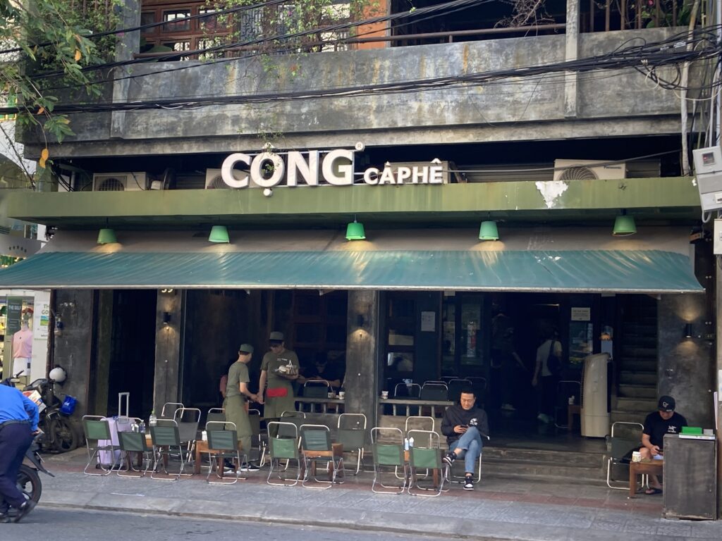 コン・カフェ。ハイランズのライバルか?店員の方々の制服がダークグリーンに赤のワンポイント。入ったら共産党員にさせられそう。