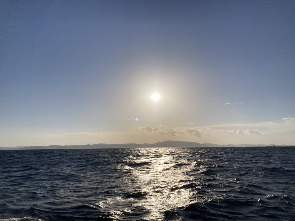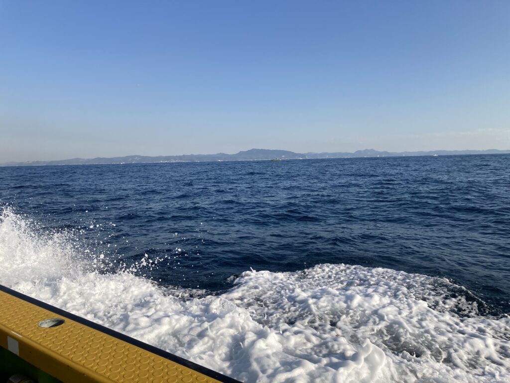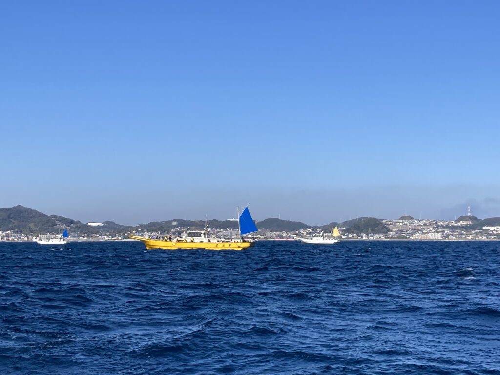 なかなかいい海ではないの、鴨居沖。と船の向きが東からくるっと南に270度回転すると・・・