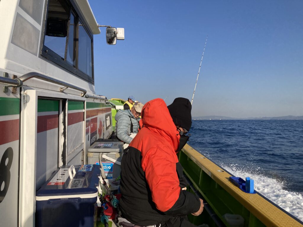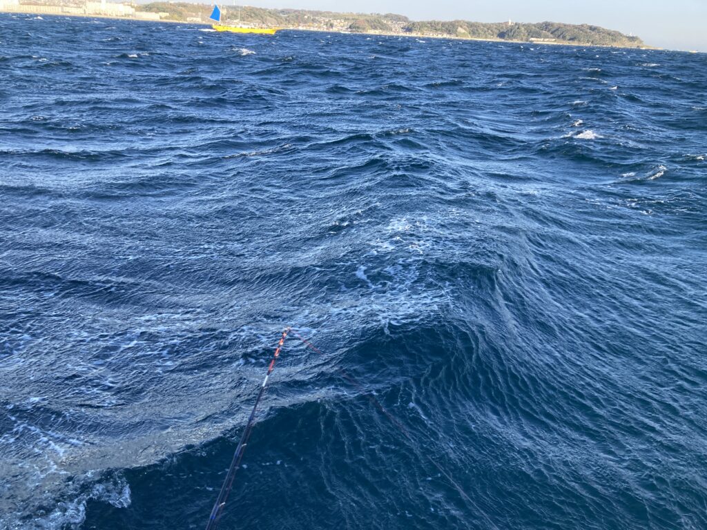 10時を過ぎると波と風は少し収まってきた。道糸も斜めに流されず真下に落ち着くようになってきた。アタリも多くなり3枚追加。