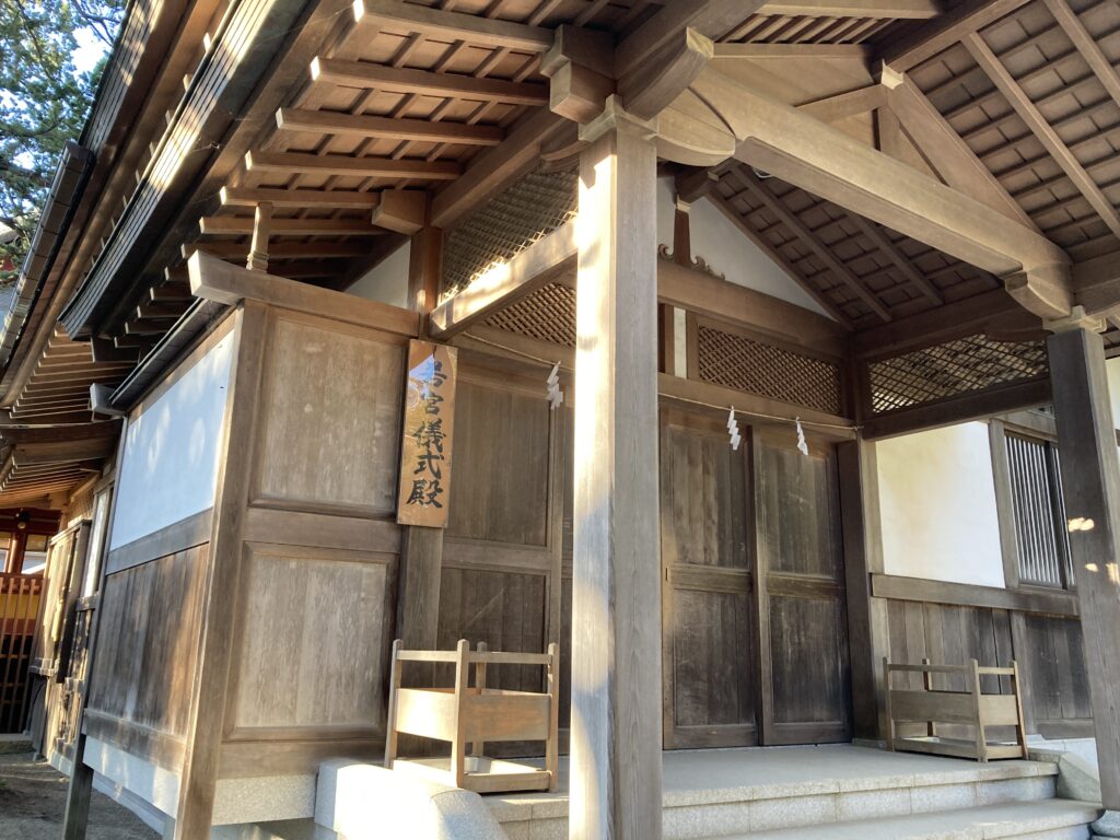 帰りは両脇の階段を降ります。向かって右の階段下には「若宮儀式殿」。2年前に姪の結婚式がスタートした場所。このあと静御前が舞った「舞殿」で降りしきる雨の中、儀式は続きました。しかし3月というのに寒かったなあ。
