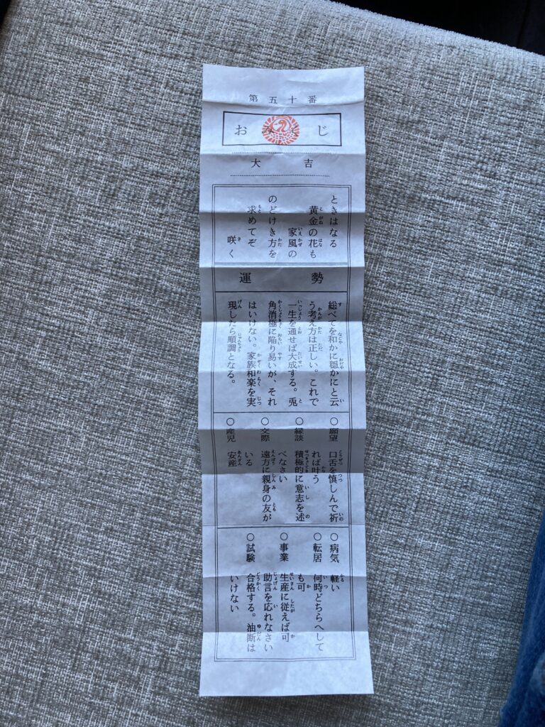 占いも超常現象も信じない私ですが、さすがに10年ぶりくらいの「大吉」は少しうれしす。なお、妻も娘もそろって「凶」を引き当てまして・・・わたしゃ生まれてこの方「凶」に当たったことなし。