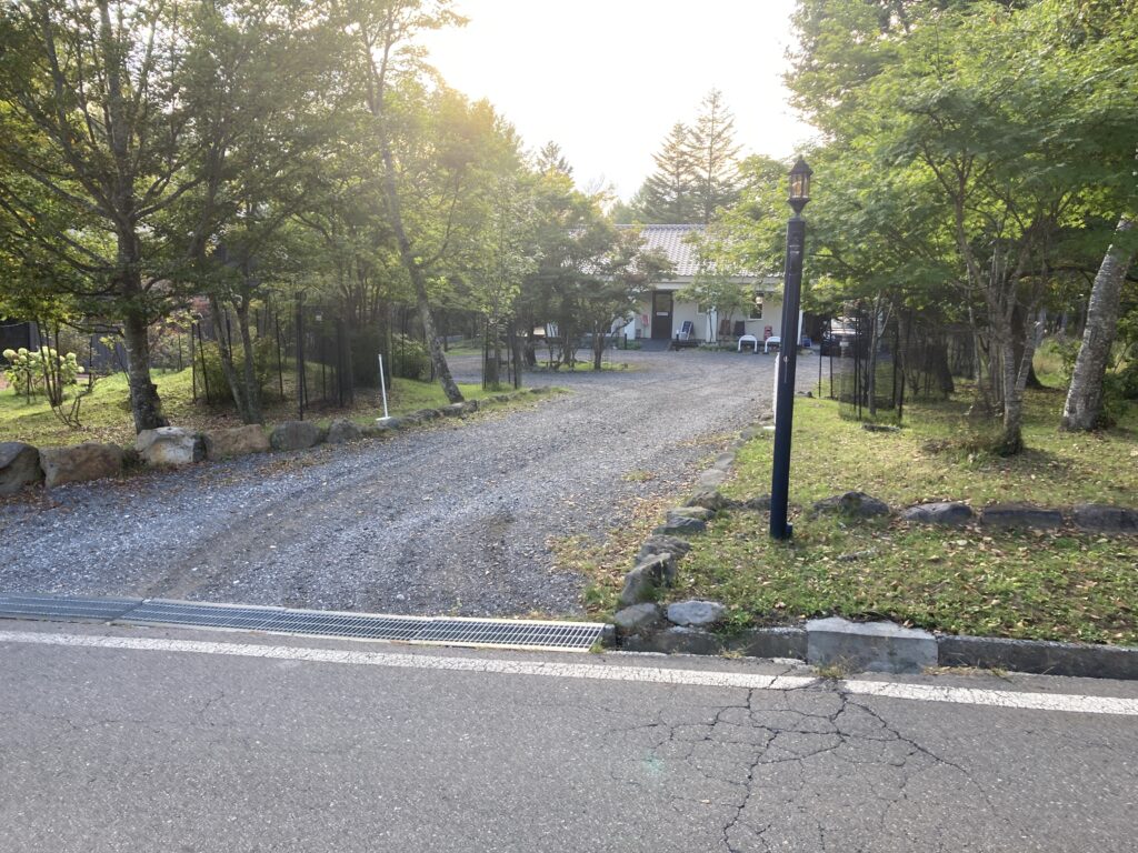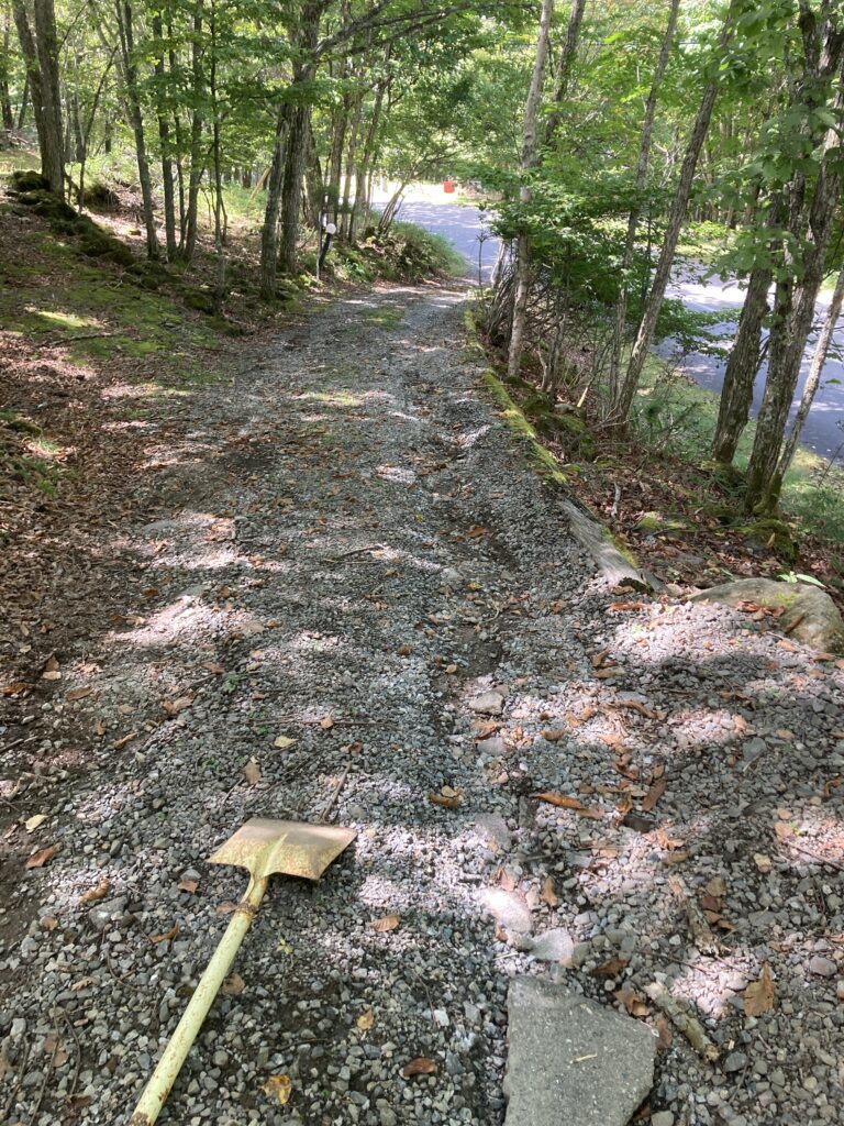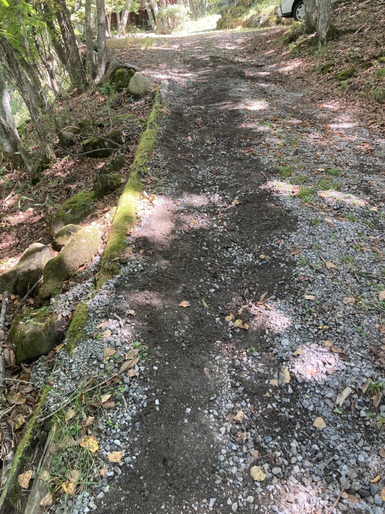 砂利道に轍ができていて、そうでなくてもデコボコが激しいのでなるべく平面にならすべく、スコップの登場。続いて63㎏の体重をかけて踏み固め。