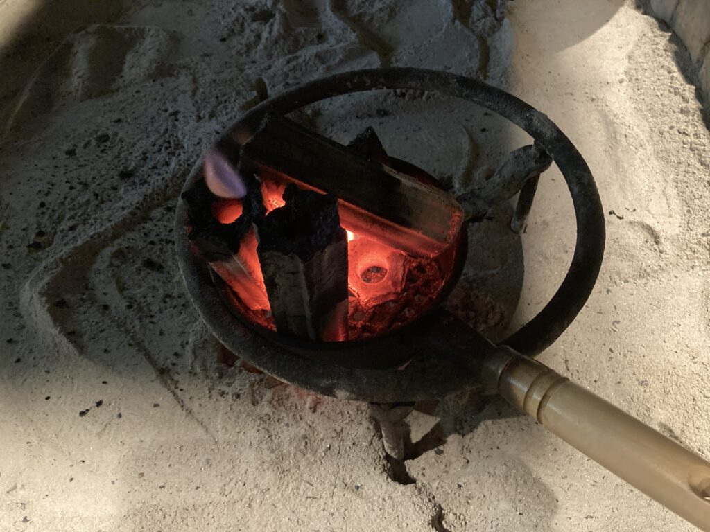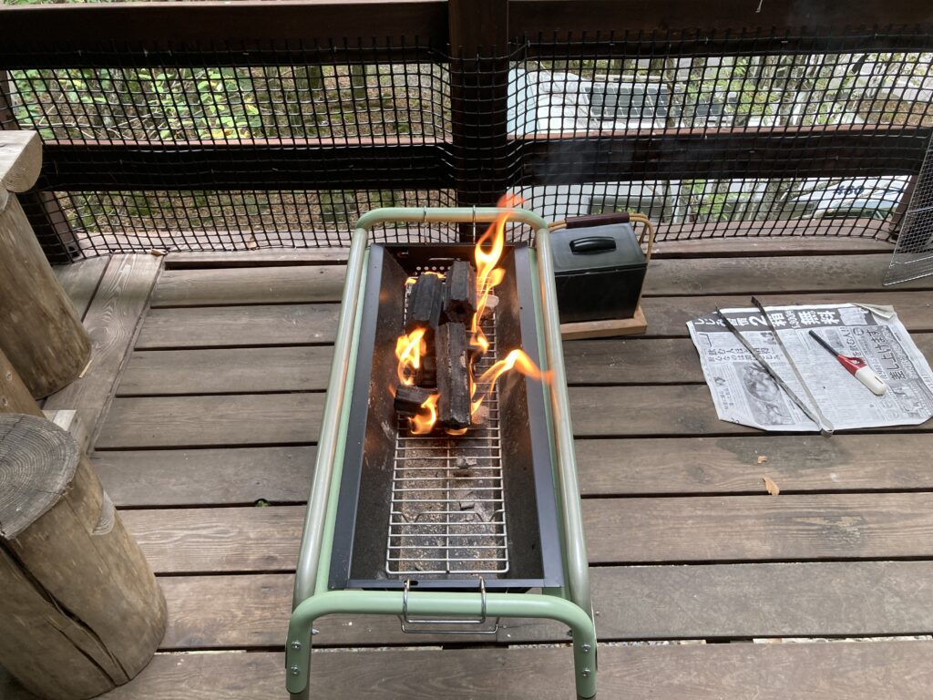 火の付きは悪いね。やっぱ火おこし器に入れなおして台所のガス台で再加熱しました。この火おこし器も一般家庭用では小さい。米国製のアルミのデカいやつにしようか。