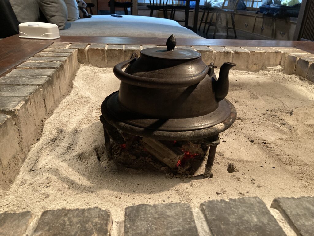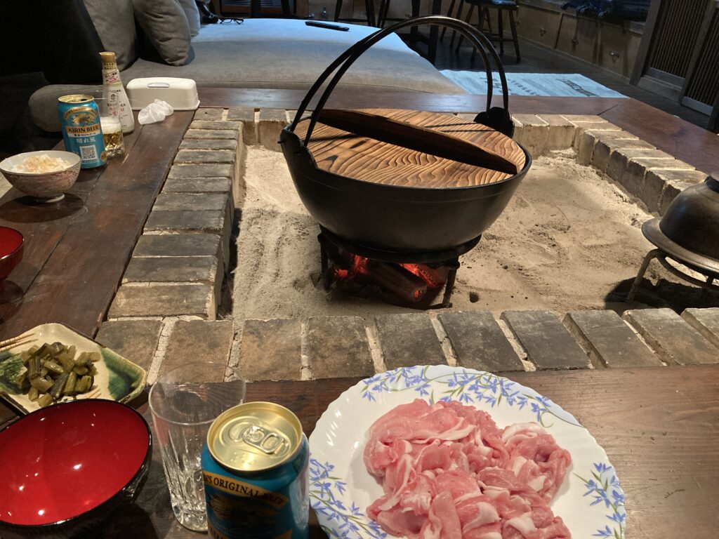 鍋の液体は沸騰しているが、なにせ鉄の「いなか鍋」はデカい。しゃぶしゃぶと揺すれば肉は食べられるがボコボコ煮立った状態とはいえない。これは火力というより器の問題か。
