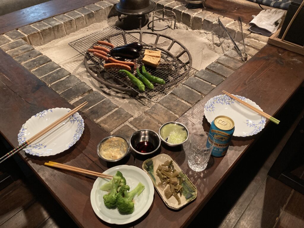 良い魚が手に入らなかったので野菜とソーセージ中心の網焼き。