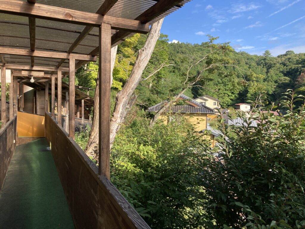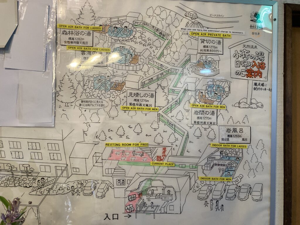 @700円。内湯の岩風呂の他に階段状の回廊を登っていくと男女ともに2つづつの露天風呂があります。84℃の源泉に加水しただけのかけ流し、らしいです。少し塩味のある硫化水素泉、PH3、らしいです。